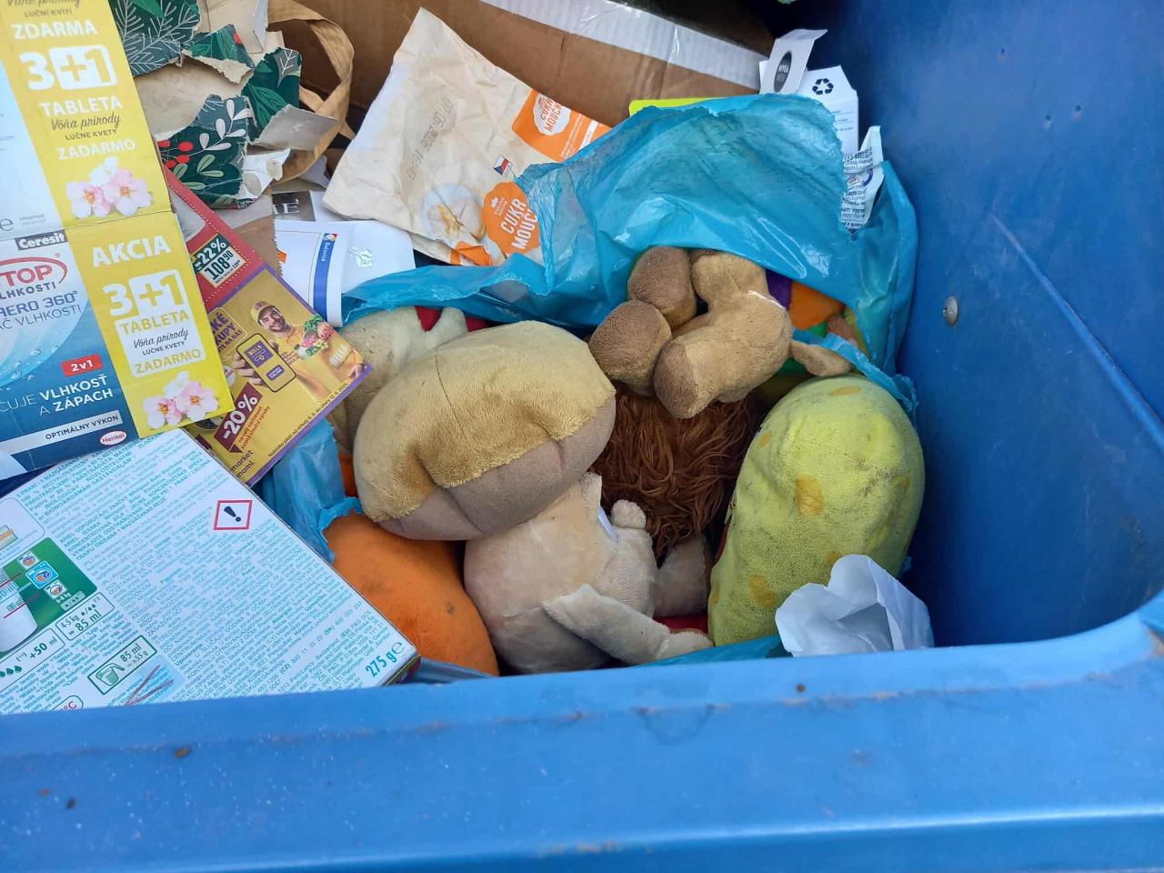 připadá vám někomu, že jsou ti plyšáci papíroví? Kdo neví, kam který odpad patří, do každého domu došla tabulka Jak třídit odpad. Minulý týden byl pytel s papírem v plastu.